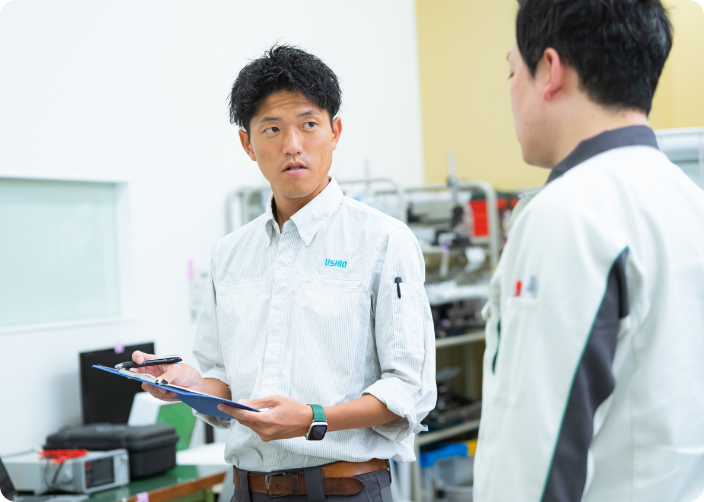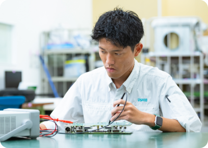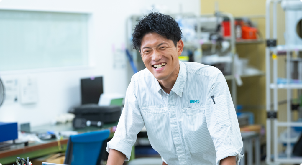 企業理念と会社の雰囲気から、個人として成長しながら働くことができそうだと感じました。「社員一人一人の人生の充実」という企業理念に、ウシオ電機の個性と魅力を感じました。会社や社員の雰囲気は、他の企業と違う明るさがあります。面接では、自分の研究内容を30分間プレゼンする場面があり、シンプルに技術のことを楽しく会話できたのも印象的でした。大学院での研究は仕事にそのまま生かせないほどニッチだったこともあって、就職活動では業務内容よりも働いている人や会社の雰囲気を重視していました。今は当時の直感を信じてよかったと思っています。