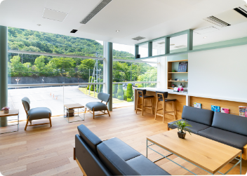 休憩スペースは、リラックスして会話ができる開放的で明るい雰囲気。社員同⼠のコミュニケーションを⾃然に促す⼤切な空間です。
