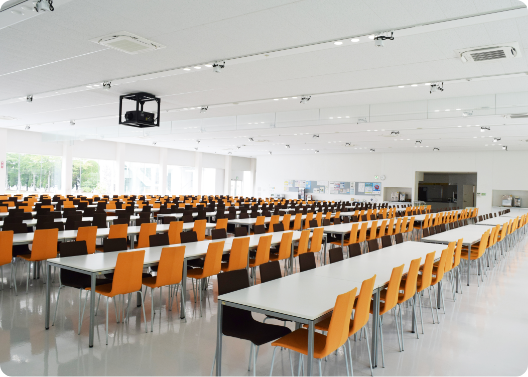 社員食堂では、窓から見える中庭の桜や緑を眺めながら、ゆったりと食事を楽しんだり、同僚と会話を楽しんだりすることができます。